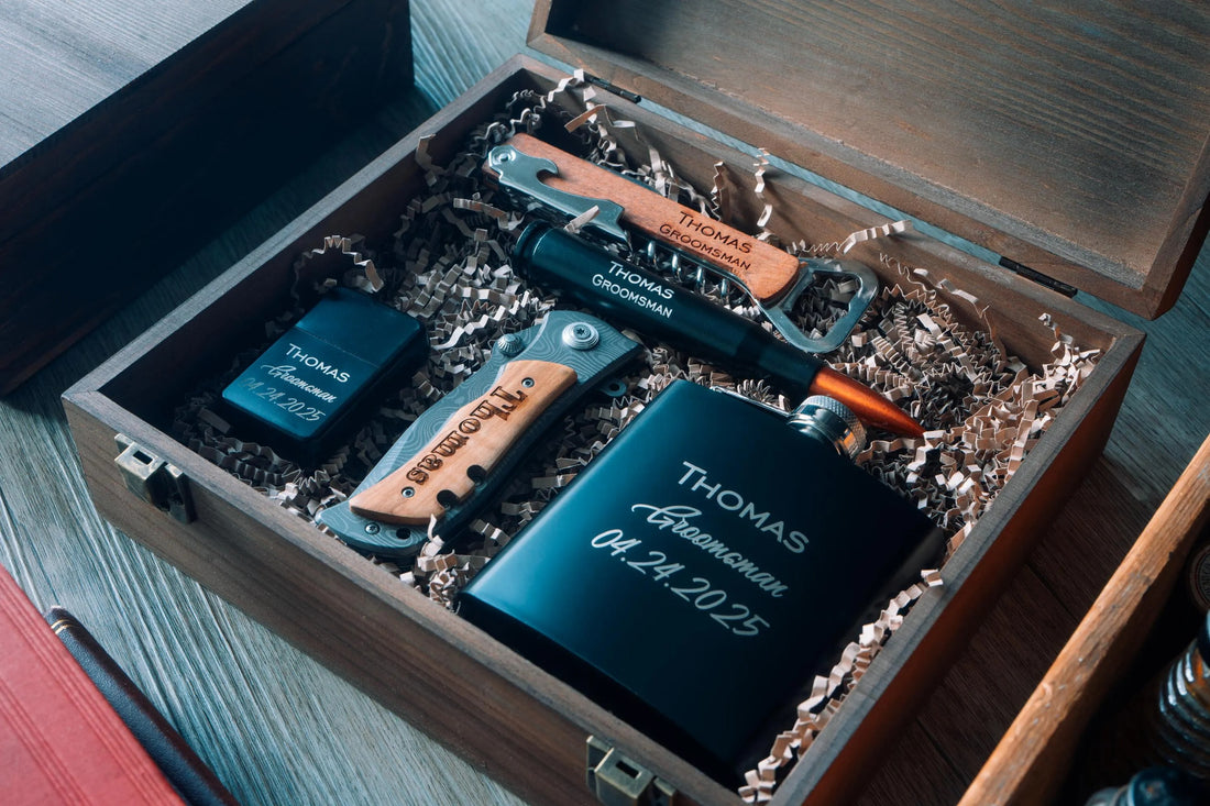 Personalized Groomsmen Gift Box: Engraved Flask, Knife & More