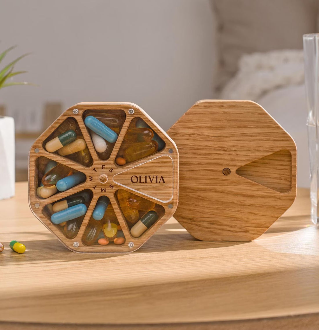Wooden Daily Pill Box 7-Day, Pill Organizer, Weekly Pill Case, Engraved Pill Container Storage