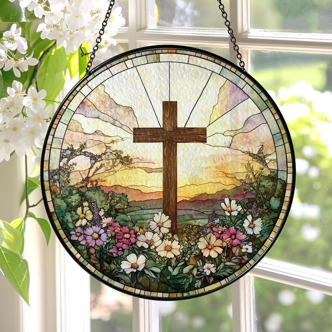 Cross and Wildflowers Stained Glass Suncatcher, Christian Glass Windows Hanging