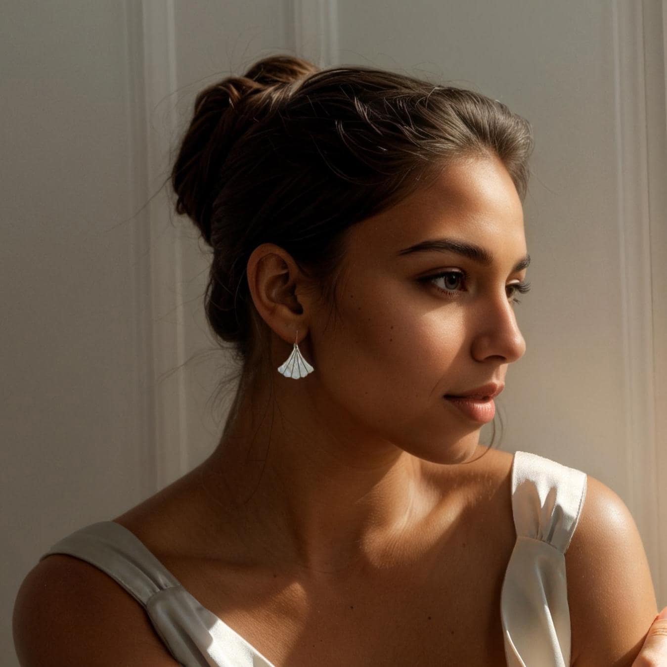 These beautiful Art Deco earrings are pure Mother of Pearl which has been carved into a simple scalloped fan shape. The pearl has an incredible sheen and take on a subtle glow when they catch the light. They are finished with gold or silver plated earwires and are designed to hang just below the earlobe.