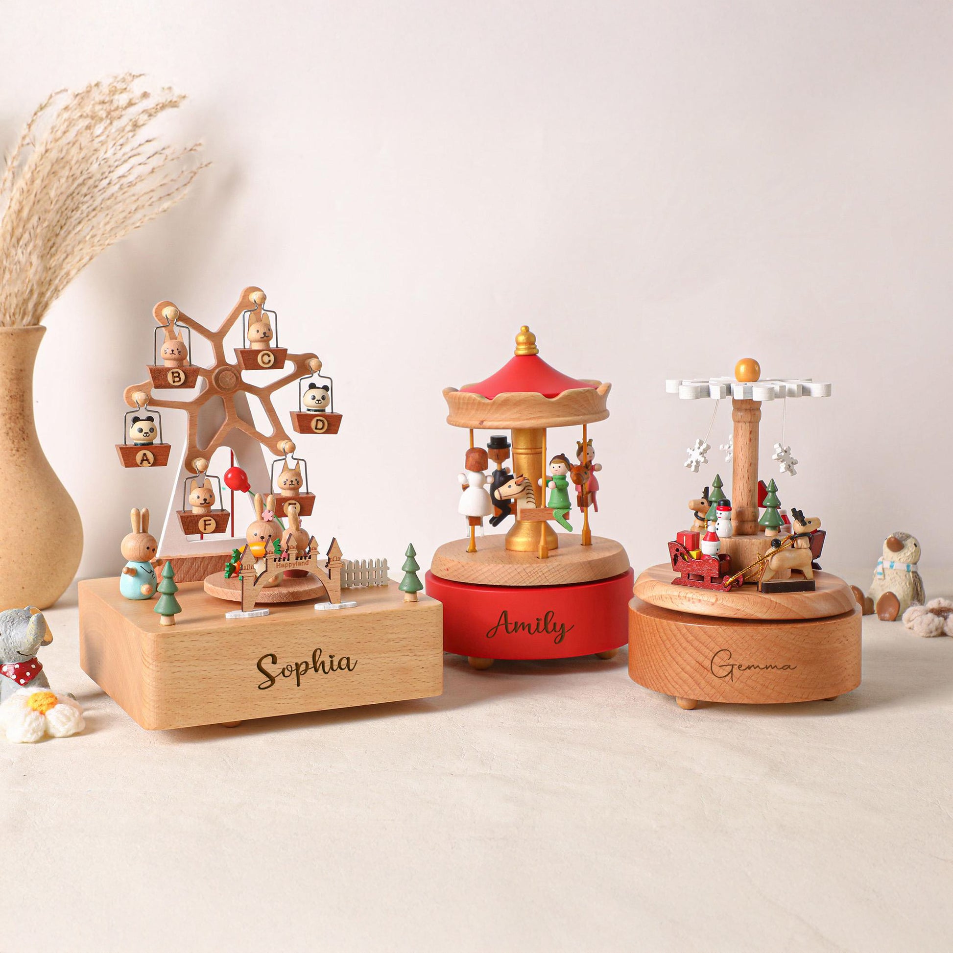 Each music box can be engraved with a custom name and icon — from Hailey with a star to Samuel with a reindeer — making it a truly one-of-a-kind keepsake. Perfect for Christmas, birthdays, baby showers, or as a newborn gift, this piece will be treasured for years to come.