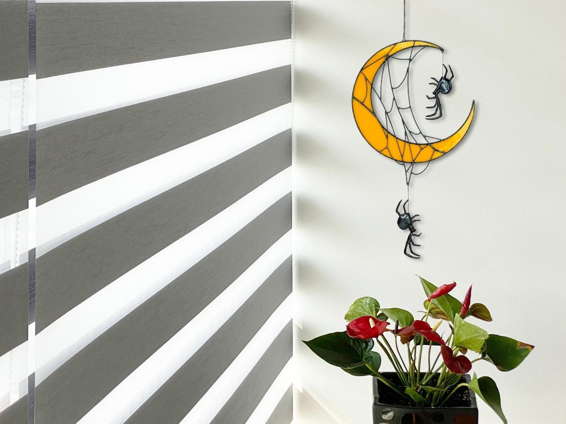 Crescent Moon Decor with Spiders. Unique Stained Glass Halloween Suncatcher for Witchy and Spooky Rooms. Crescent Moon Gift with Spider Web