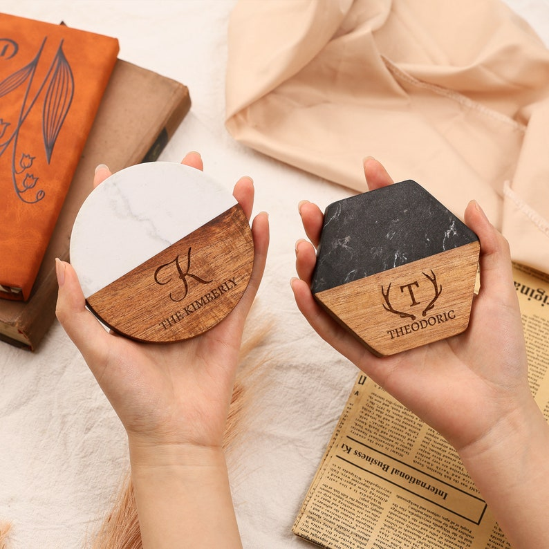 Custom Marble Wooden Coaster, Wedding Favors Bulk Engraved Coasters, Personalized Gift for Housewarming, Anniversary, Gifts for Newlyweds