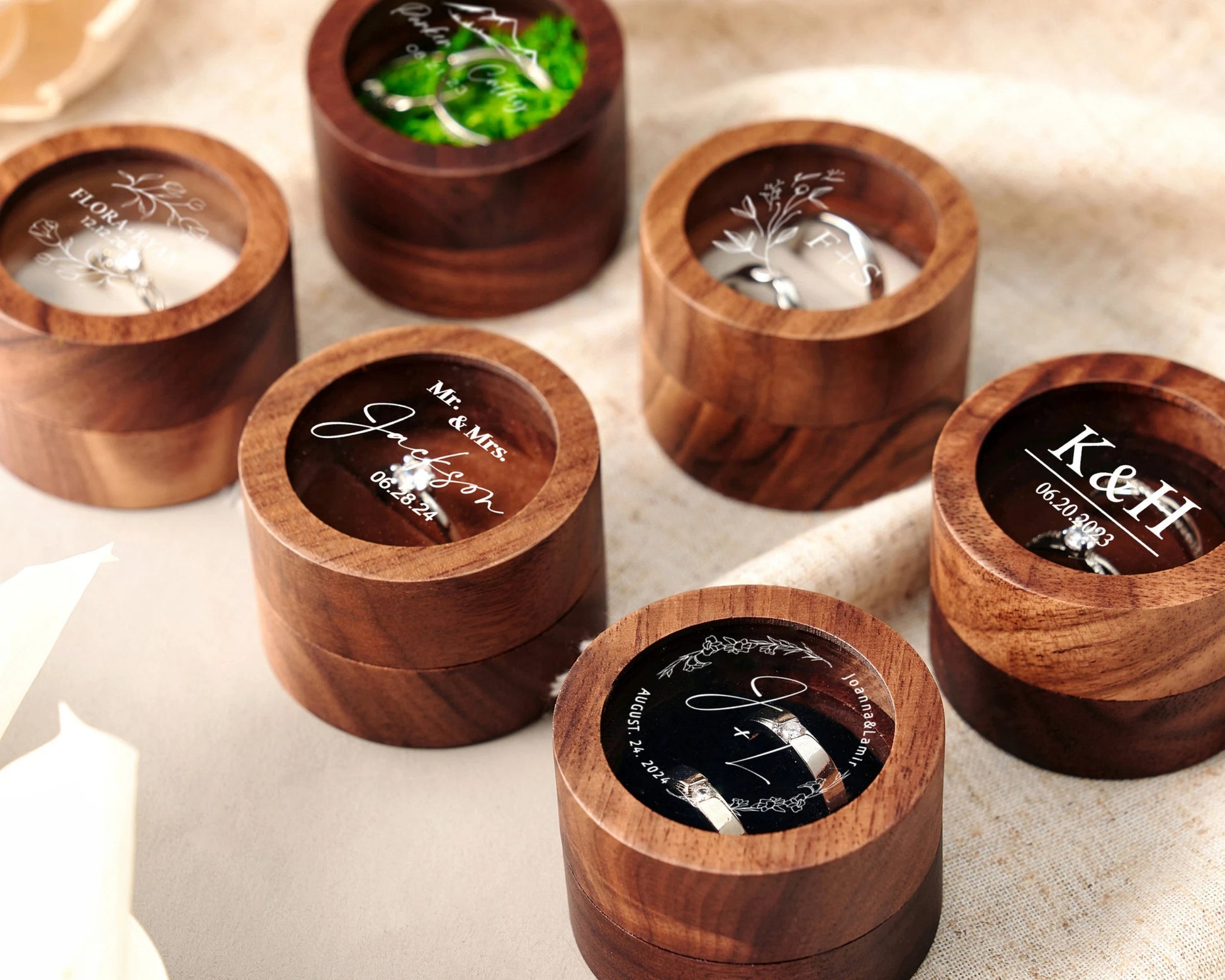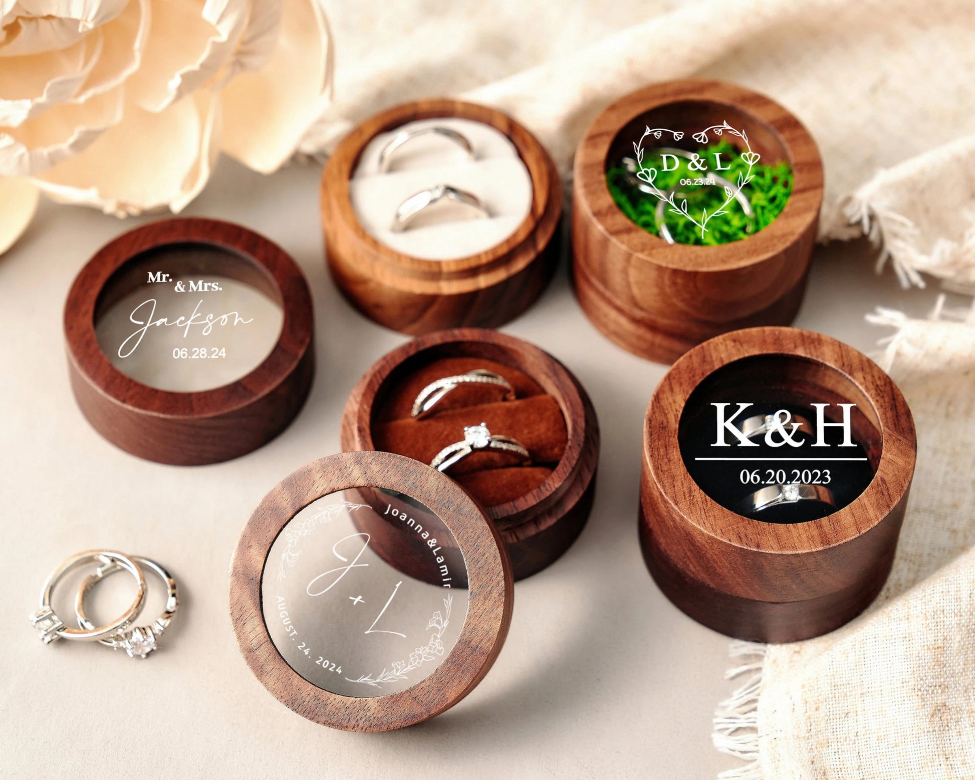 Custom Wooden Wedding Ceremony Round Ring Box, Clear Acrylic Cover, Personalized Engraved Engagement Proposal Holder, Bridal Gift For Her