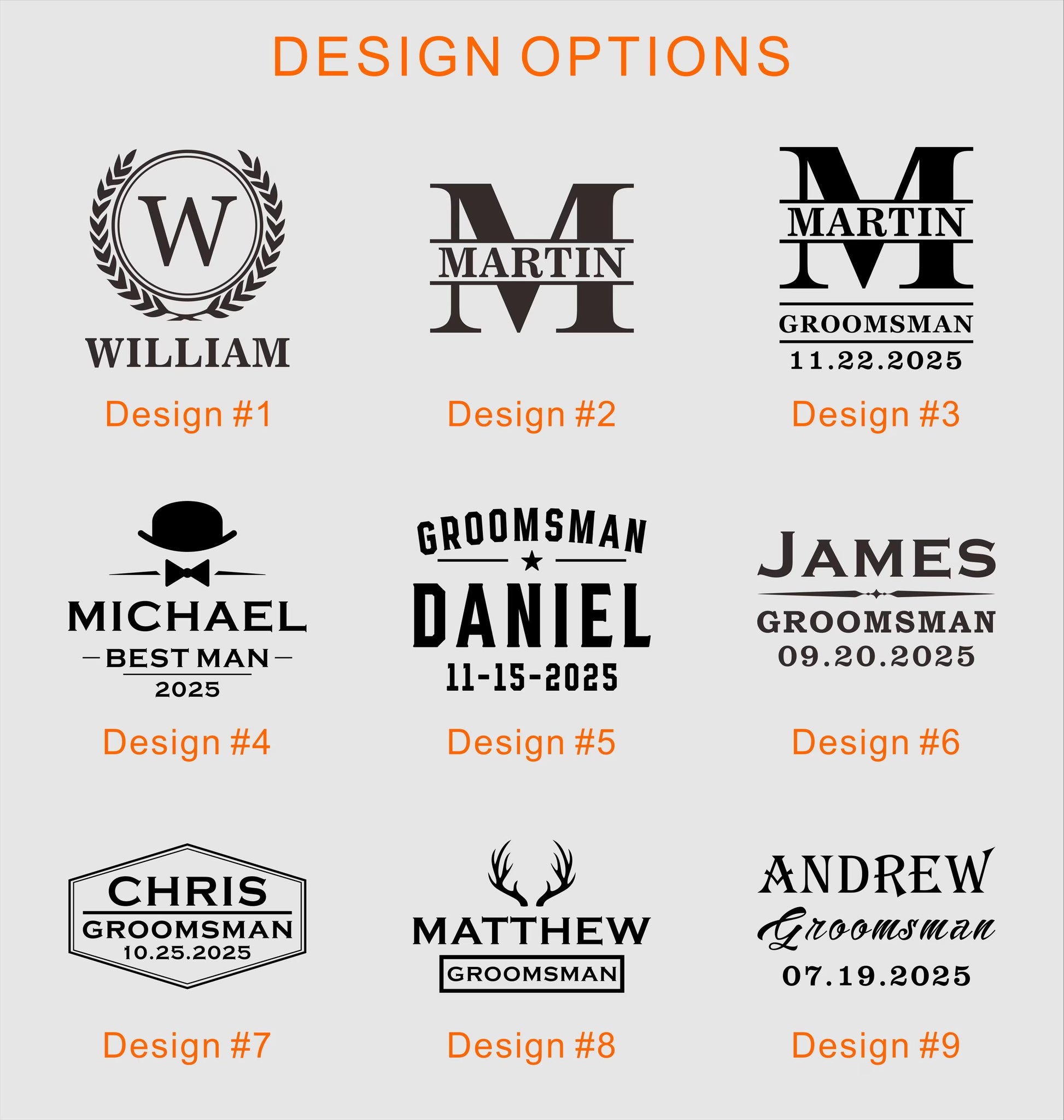 Available as single pieces or in curated groomsmen gift sets (flasks, knives, bottle openers, and more)