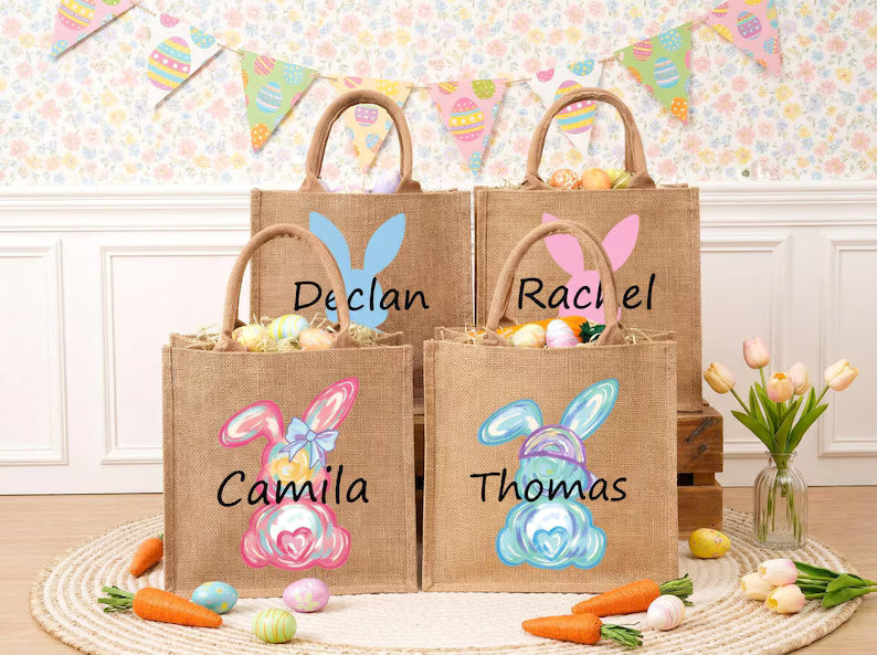Personalized Easter Jute Tote Bag with Bunny Design – Kids Egg Hunt Carrier