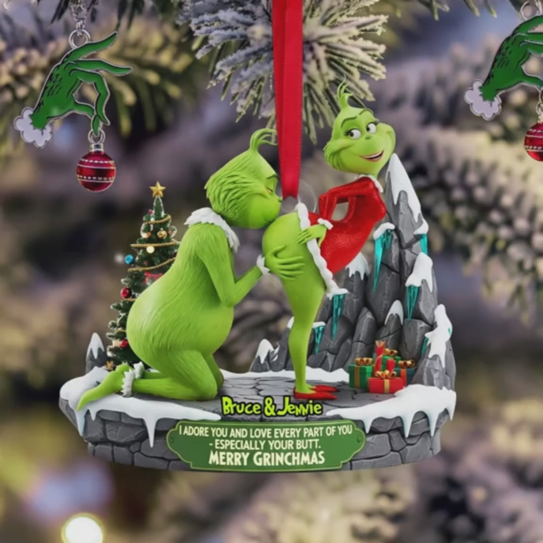 Personalized Green Monster Couple Christmas Ornament, I Adore You , Custom Holiday Tree Decoration, Flat 2D Ornament, Merry Grinchmas Gift