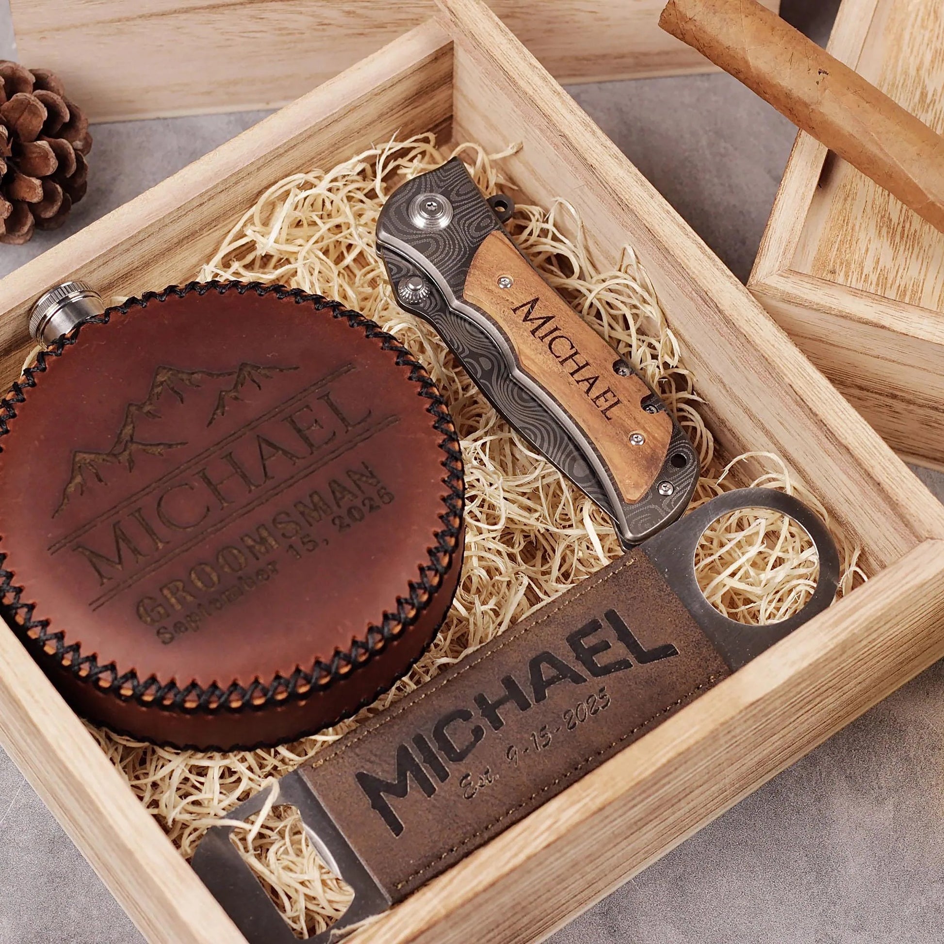 Personalized Groomsmen Gift Box Set: Leather Wrap Flask + Classic pocket knife + Leather Bottle Opener - proposal box set custom engraved