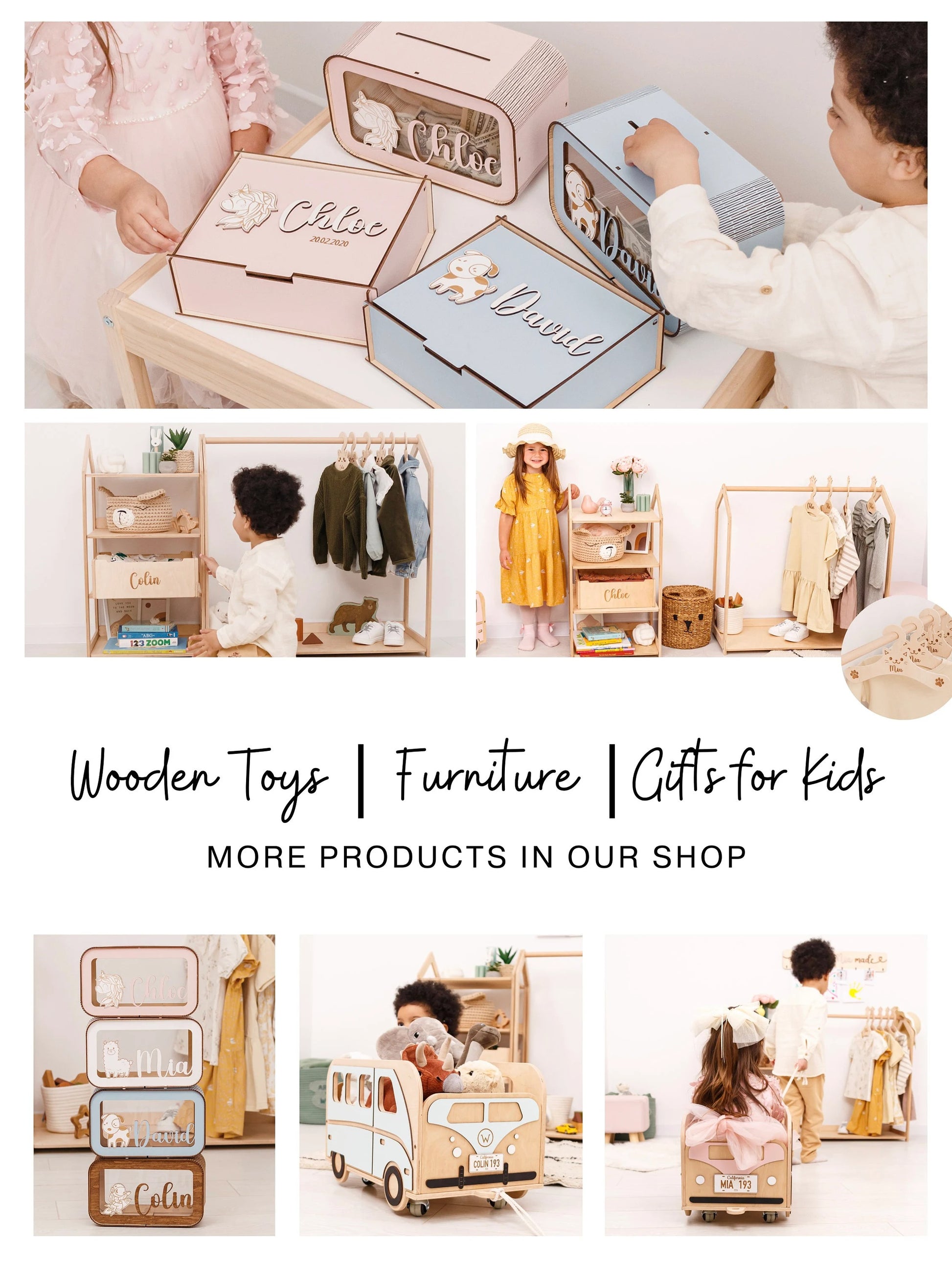 Bring joy, learning, and keepsake value into a child’s world with our handcrafted wooden toy collection. From personalised name trains and buses to Montessori puzzles, piggy banks, rattles, and developmental toys, each piece is designed to inspire creativity and imagination while being safe, eco-friendly, and durable enough to last for generations.