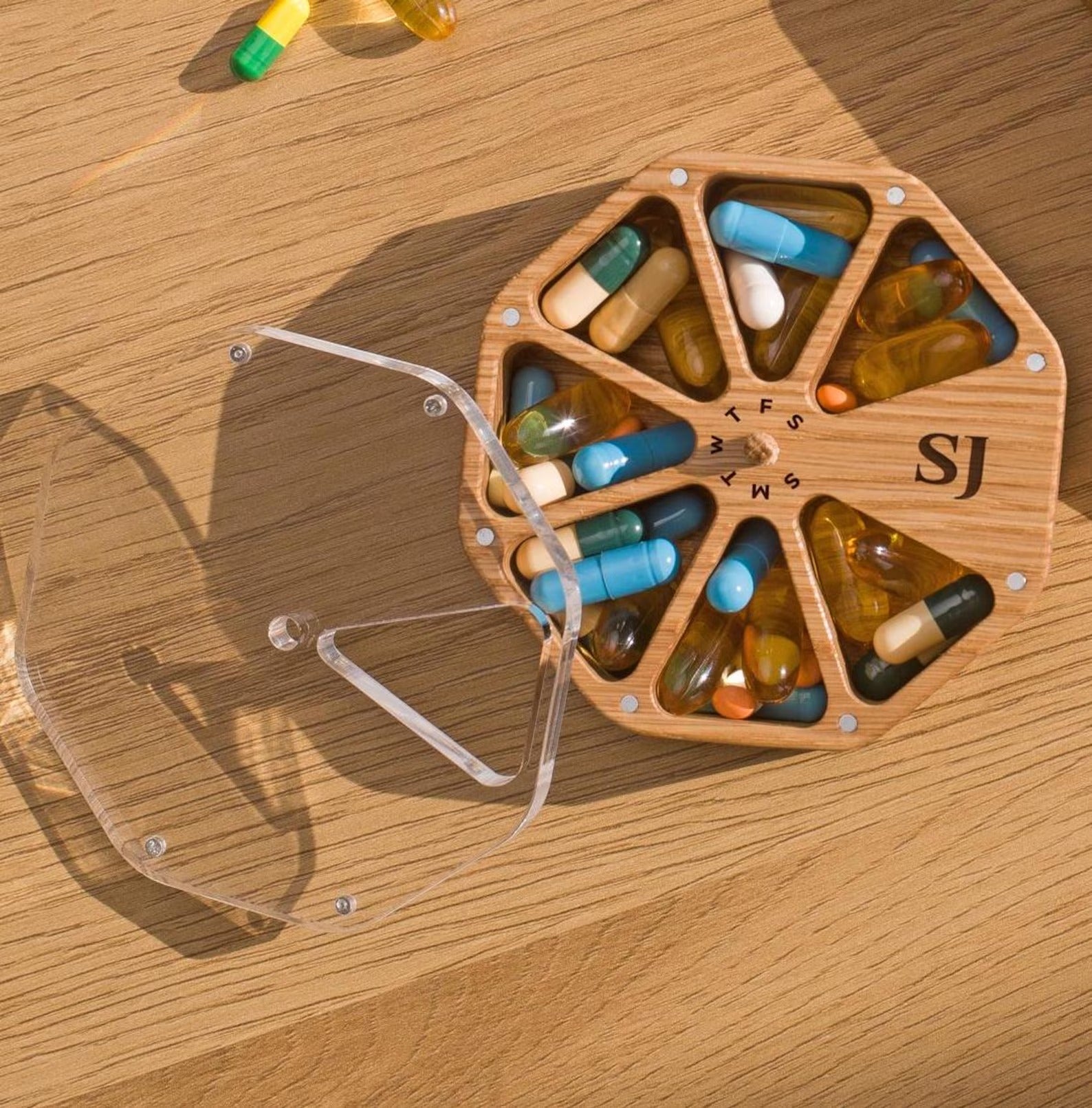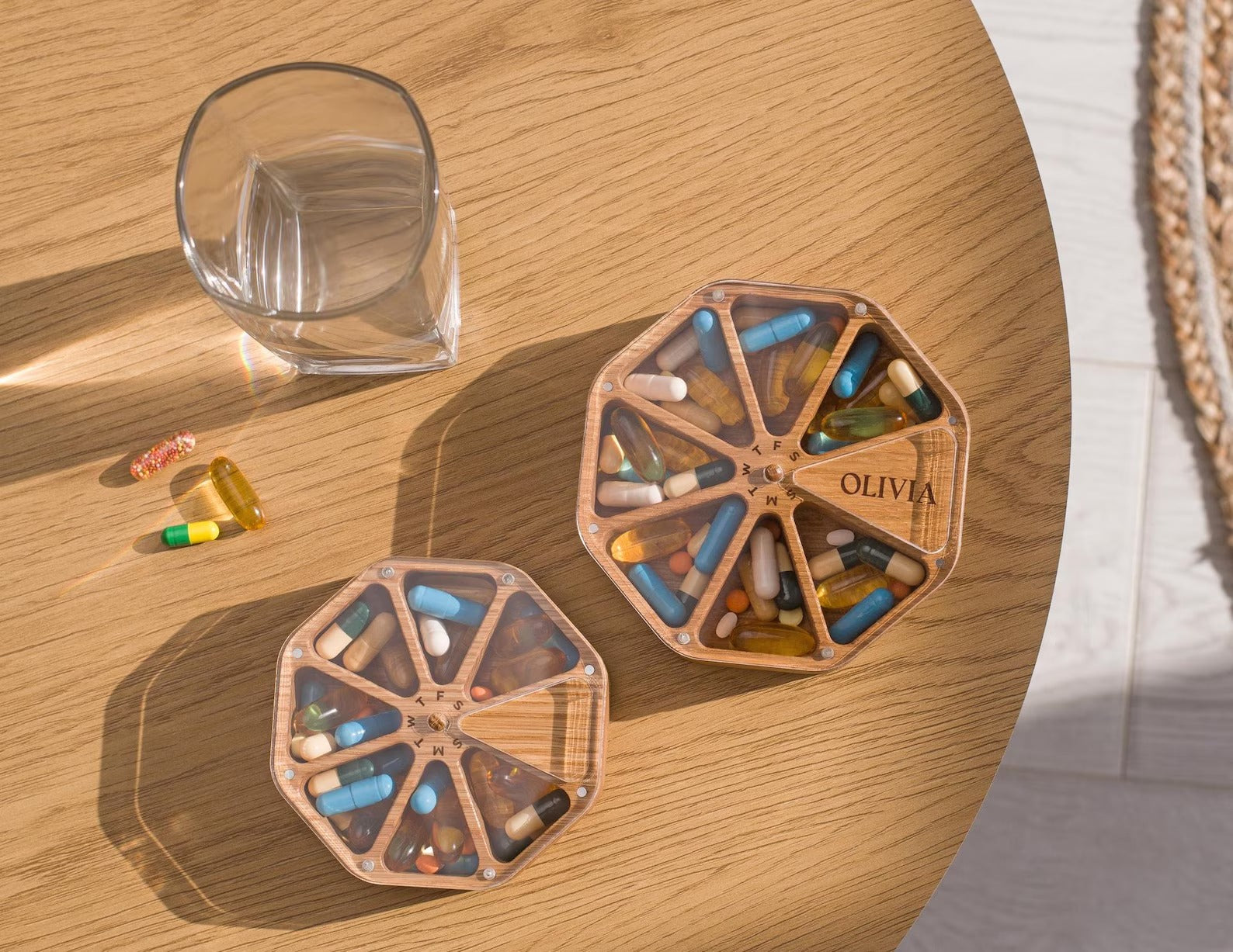 Stay organised in style with our handcrafted wooden pill containers, designed to keep your daily medication, vitamins, or supplements secure and easy to access. From compact travel pill boxes to 7-day organisers with medication logs, each piece combines functionality with elegant natural wood craftsmanship.