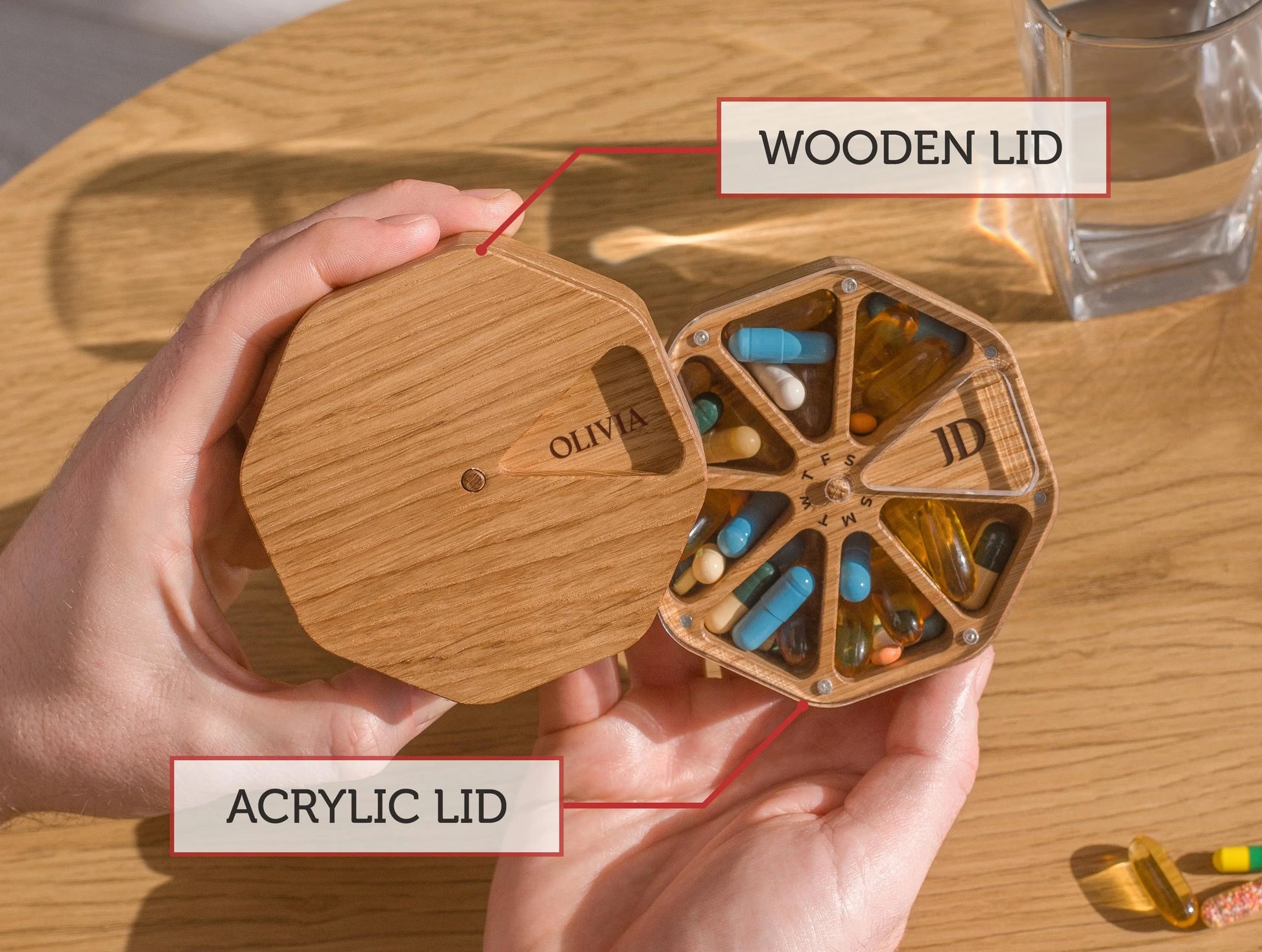 Stay organised in style with our handcrafted wooden pill containers, designed to keep your daily medication, vitamins, or supplements secure and easy to access. From compact travel pill boxes to 7-day organisers with medication logs, each piece combines functionality with elegant natural wood craftsmanship.