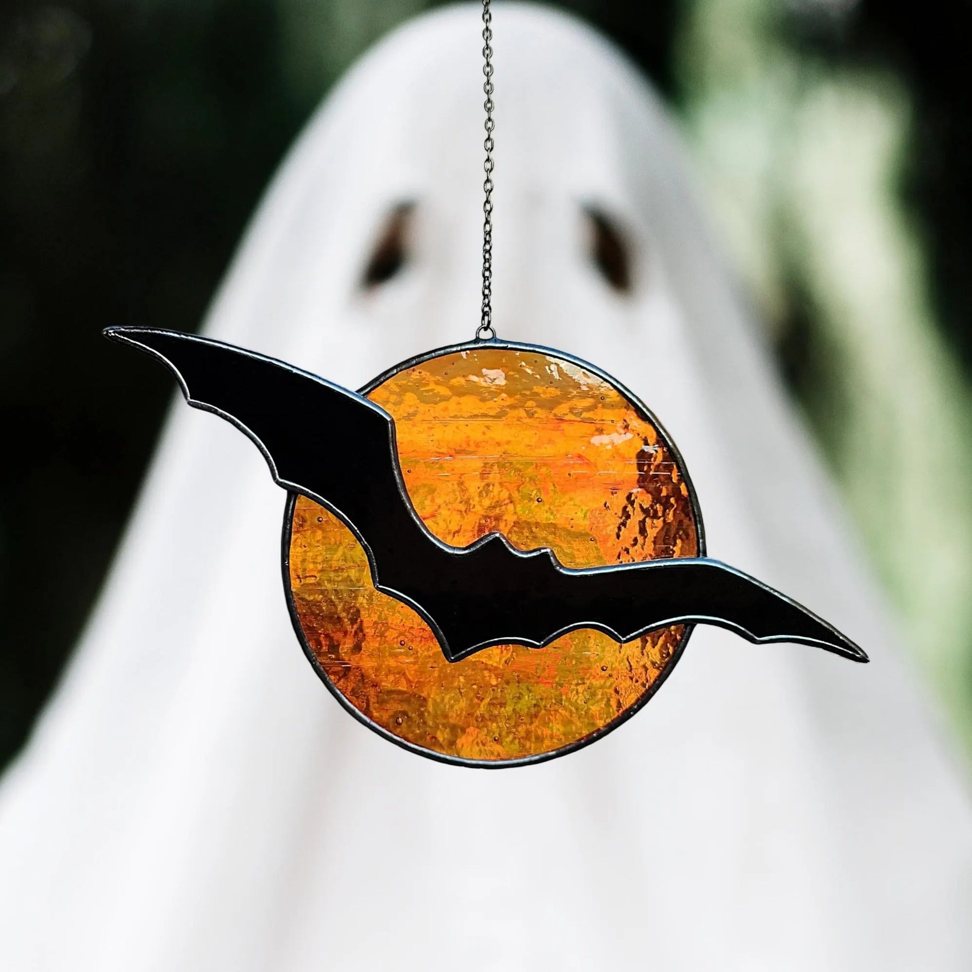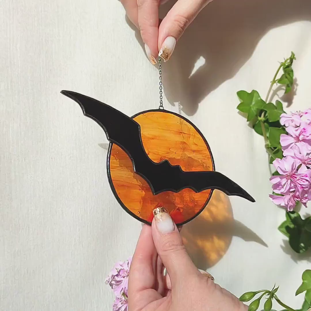 Stained Glass Bat and Moon Suncatcher. Perfect Halloween Decor for Spooky Season. Add Gothic Charm to Your Home or Garden Display.