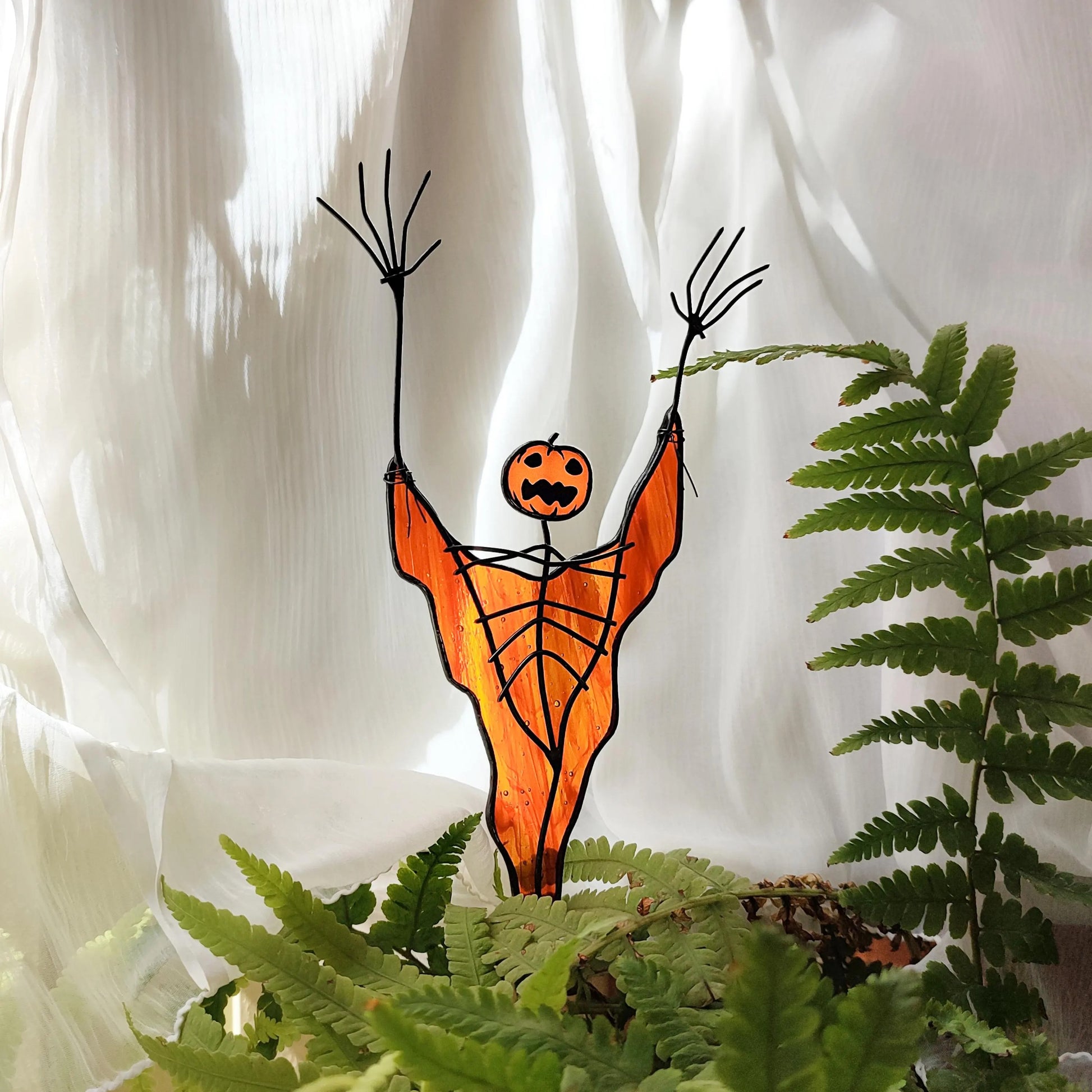 Stained Glass Scarecrow with Pumpkin Head Plant Stake Halloween Decor. Spooky Garden Decoration for Halloween Display. Unique Halloween Gift